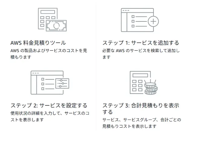 「AWS を導入する前に、どの程度の費用がかかりそうか」を把握するための出発点となります。複数のサービスをまとめて見積もる「グループ」機能を備えており、たとえば Web サーバー・DB・ストレージを一つの構成として整理できます。