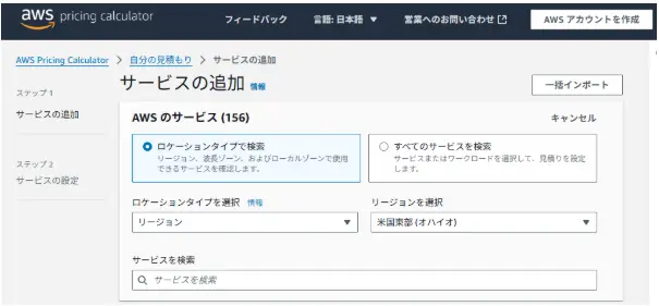 トップ画面で「見積もりを作成する」をクリックすると新規見積が開始できます。まずは見積の名前や通貨(JPY/USD など)を指定し、その後に必要なサービスを選んで追加していく形です。