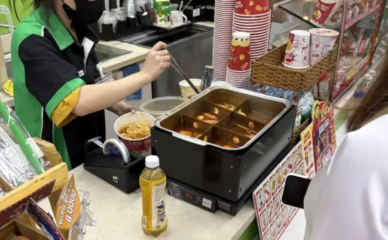 なお、ベトナムのコンビニは日本のものとは少し異なり、ホットコーナーやドリンクコーナーが非常に充実しています。肉まんやフライドチキンに加え、韓国風の赤いおでんのような食品が並ぶこともあります。
